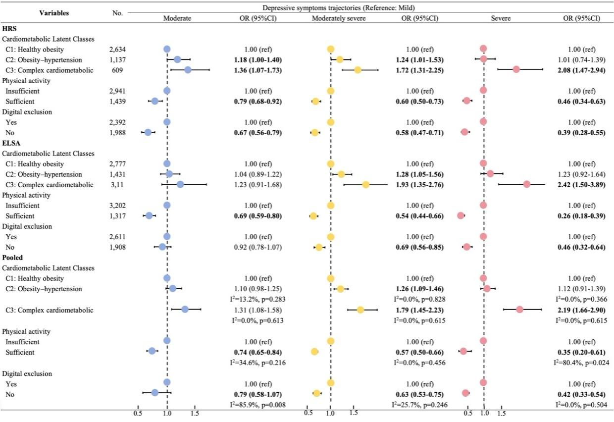 抑郁症已成为全球性中老年人的精神健康危机,被WHO定义为致残的首要因素。团队研究发现,糖尿病等代谢危险因素会增加持续高水平抑郁症状的风险,而数字参与和充足身体活动会降低抑郁风险。此外,充足身体活动还可以抵消肥胖-高血压和复杂心血管代谢模式的危害,揭示身体活动和数字参与综合干预可有效降低中老年人抑郁症负担。上述研究成果以“Clustering of cardiometabolic risk factors, physical activity, digital exclusion and depression trajectories in adults aged 50 years and older: Findings from two prospective cohort studies”为题,发表于国际权威期刊BMC Medicine(中科院一区Top,5年影响因子9.4)。该文以山东大学为第一和通讯作者单位,公共卫生学院博士后董晓升为本文的独立第一作者,周成超教授为唯一通讯作者。