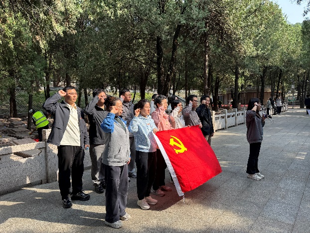 在烈士陵园内,全体党员整齐列队,肃立奏唱国歌。随后,党员代表王志萍老师向纪念碑敬献花束,全体同志集体默哀一分钟,并向长眠于此的革命先烈行三鞠躬礼,表达深切的哀思与崇高的敬意。在庄严的纪念碑与党旗前,由支部书记领誓,全体党员重温入党誓词。铿锵有力的誓言回荡在山间,提醒着每一位党员铭记入党初心,强化身份意识,恪守对党的忠诚与承诺。