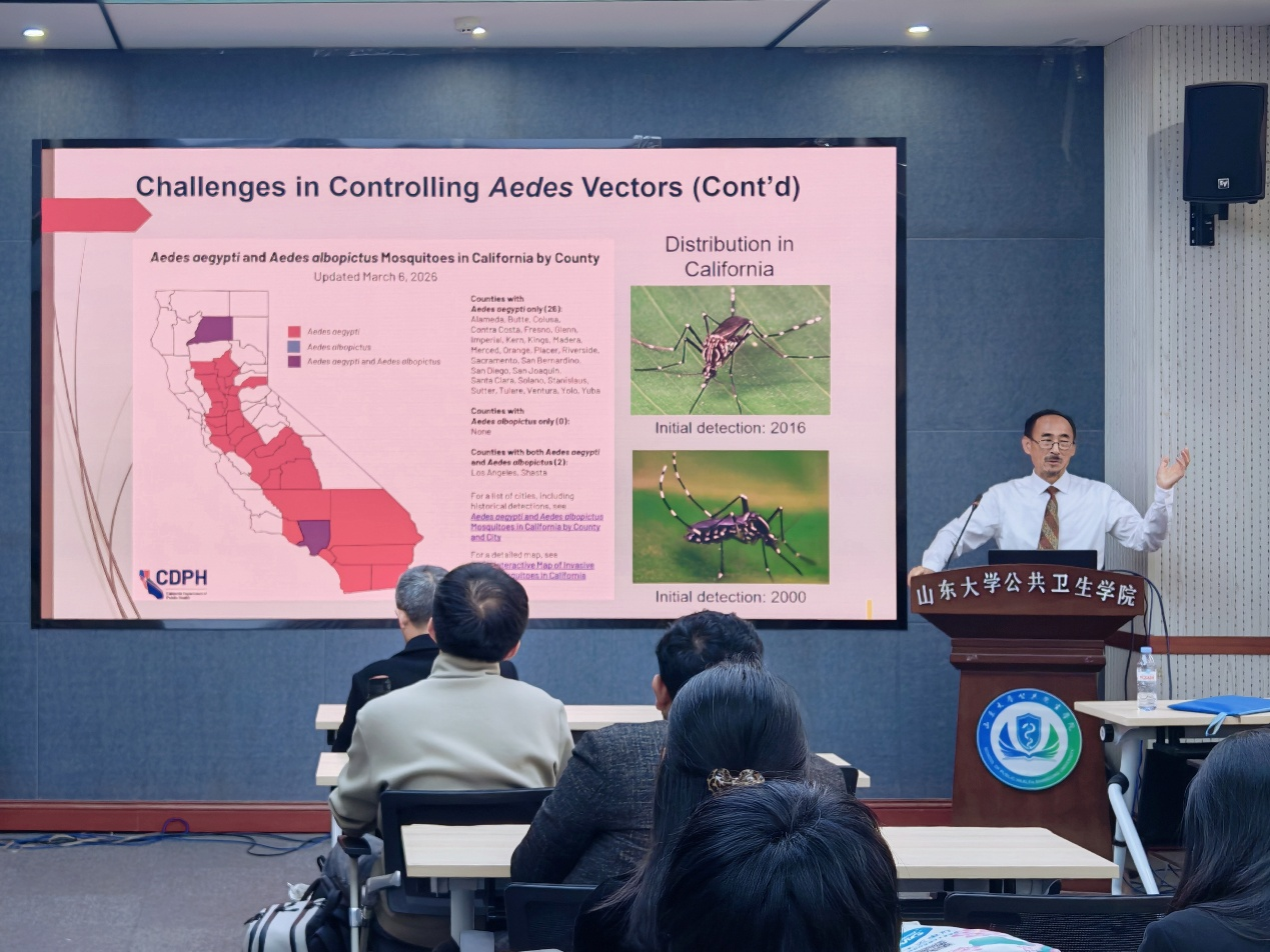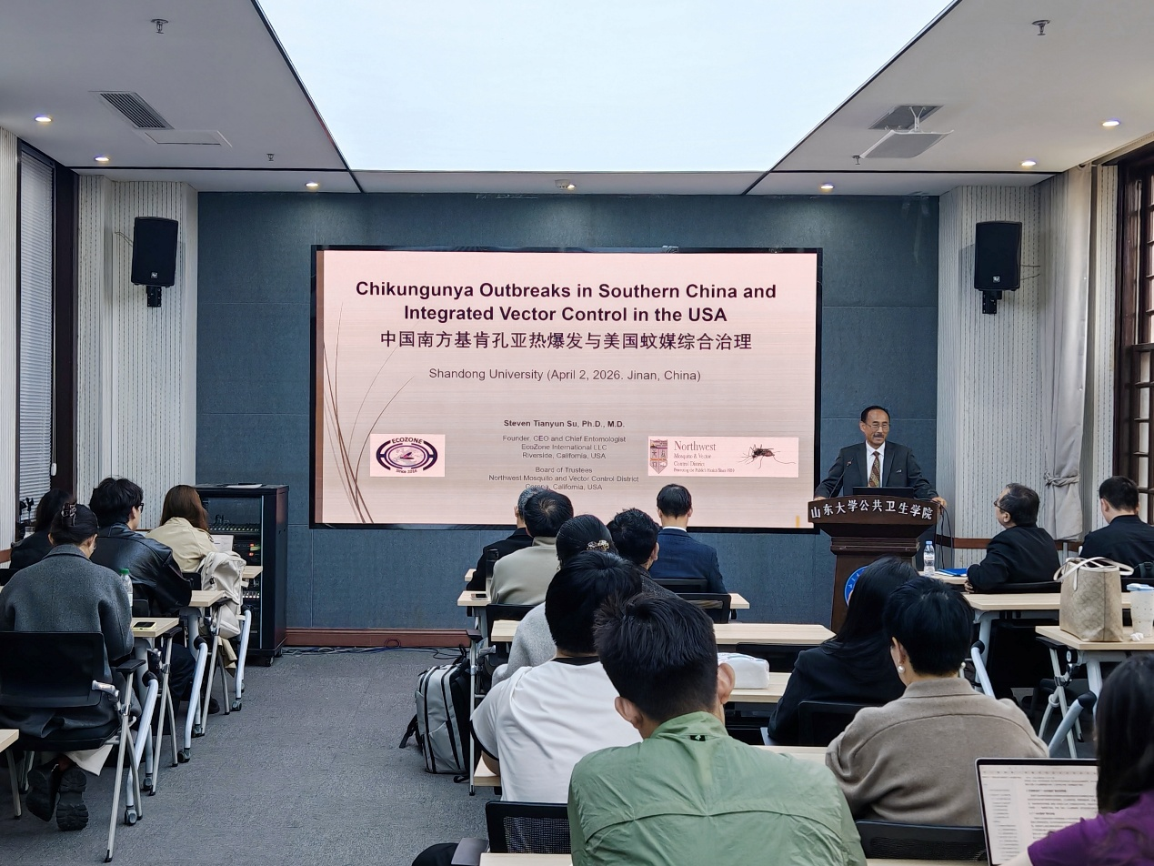 4月2日,公共卫生学院主办的齐鲁公卫大讲堂在趵突泉校区举行。美国加州西北蚊虫及病媒防治局董事、美国绿媒国际首席执行官,美国加州西谷蚊虫及病媒防治局前高级研究员与科技总监苏天运教授作了题为“中国南方基肯孔亚热暴发与媒介综合治理”的学术报告。讲座由山东大学公共卫生学院副院长马伟主持,学院相关专业师生代表参加此次学术交流活动。