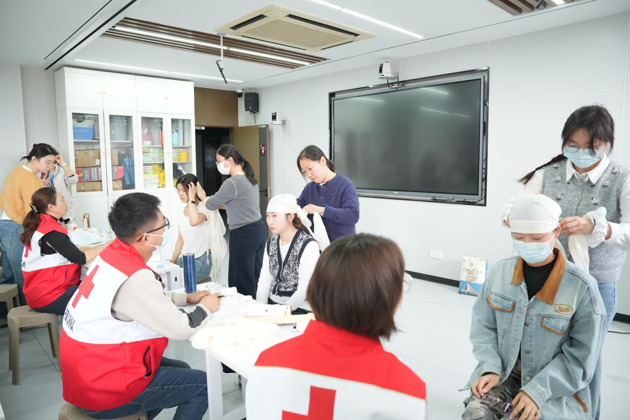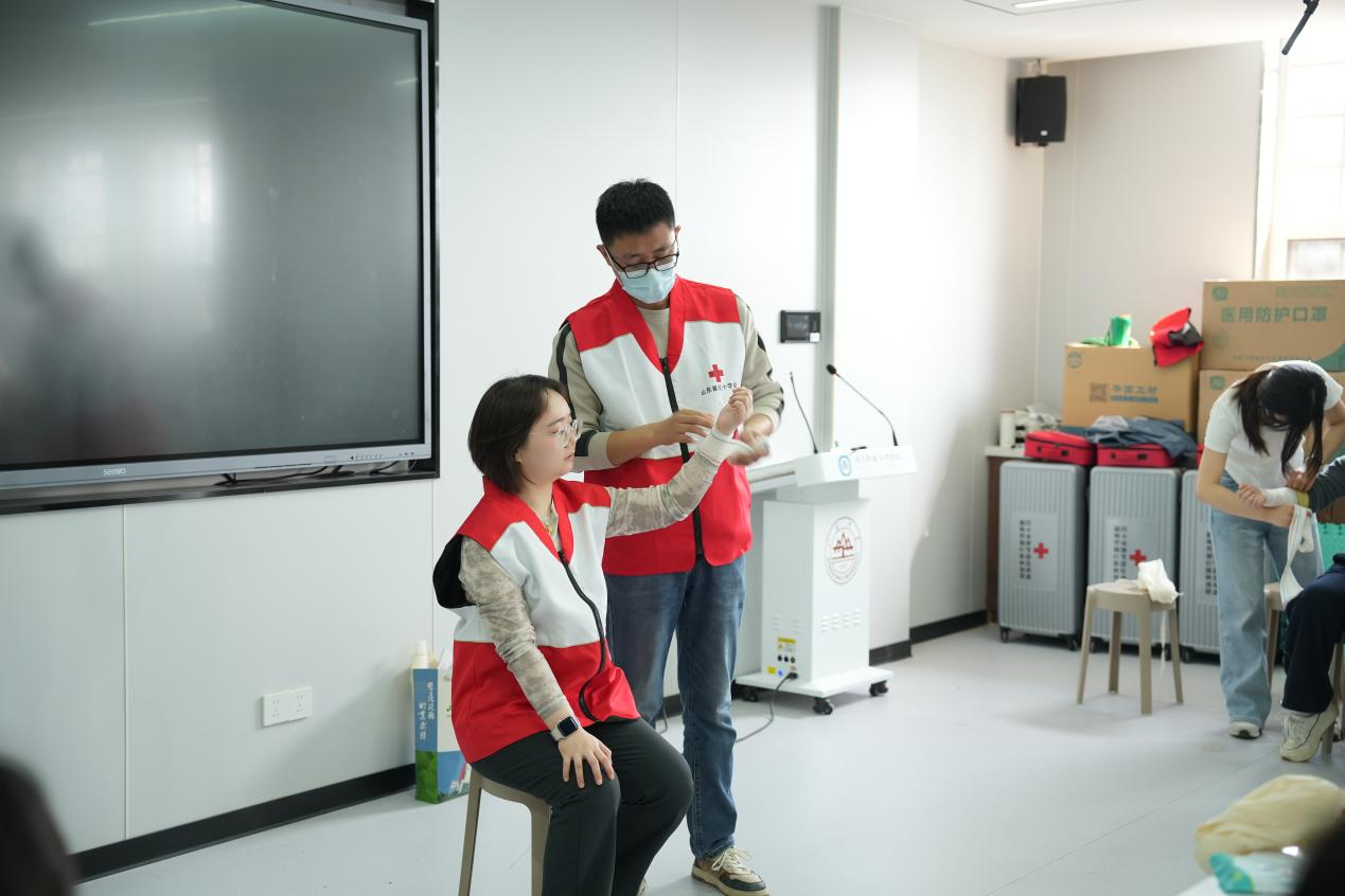 培训活动设置了“理论学习—实操训练—考核认证”三个环节。理论学习阶段,同学们提前在线上围绕心肺复苏(CPR)、自动体外除颤器(AED)的使用、常见创伤处理方法等内容展开学习,并完成理论考试。实操训练环节,在主讲教师完成胸外按压、人工呼吸、止血包扎等动作示范后,参训学生分组进行相关技能练习,并由主讲教师对学生操作进行针对性指导与纠正,确保每一项操作达到规范标准。培训最后组织开展红十字会初级救护员资格考核,对学员学习成果进行全面检验。